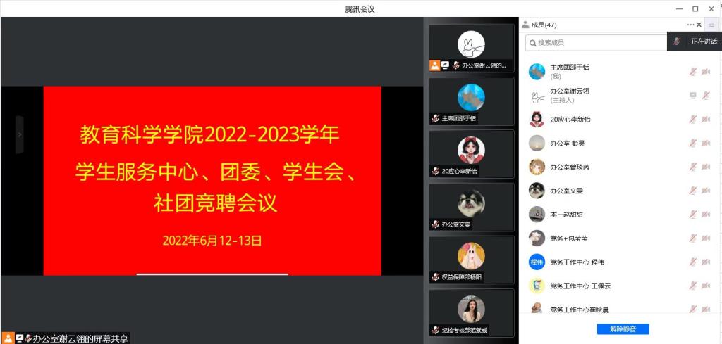 時(shí)間:2022-06-19 19:39:08 來源: 作者: 閱讀: 次6月13日至6月14日,教育科學(xué)學(xué)院線上召開2022-2023學(xué)年學(xué)生服務(wù)中心、團(tuán)委、學(xué)生會(huì)、社團(tuán)工作人員競聘大會(huì)。主席團(tuán)成員、各部門部長、副部長以及此次競聘人員參加會(huì)議。會(huì)議由辦公室主任謝云翎主持。