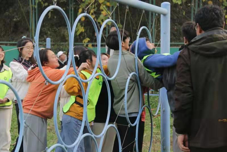 經(jīng)過“花開花落”、“逛公園”等一系列熱身活動后,教練員帶領同學們進入心語素拓園進行素拓。此次素拓活動設有“緊急逃生墻”、“穿越生死網(wǎng)、“信任背摔”等,類型豐富,趣味十足,全部活動都在教練員的指導與看護下完成,保證了同學們的安全。其中,“緊急逃生墻”是指墻上和墻下同學一起齊心協(xié)力幫助“逃生者”逃生成功的——在“逃生”過程中,墻下同學將“逃生者”托舉上去的同時,墻上的同學們合力拉住,最終所有“逃生者”翻墻成功。面對三人高的逃生墻大家團結一心,共同完成了這一艱難項目,展現(xiàn)了友好互助的優(yōu)良風貌。在“穿越生死網(wǎng)”項目中,同學們積極開動腦筋,采取多種方法在不觸碰電網(wǎng)的條件下成功完成。游戲過程中,同學們相互幫助、共克困難,既增進了感情,也充分體現(xiàn)出了同學們的大局意識和集體觀念。