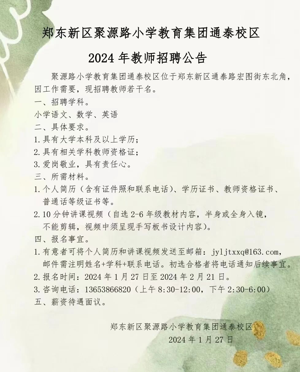 鄭東新區(qū)聚緣路小學(xué)教育集團(tuán)通泰校區(qū)2024年教師招聘公告
