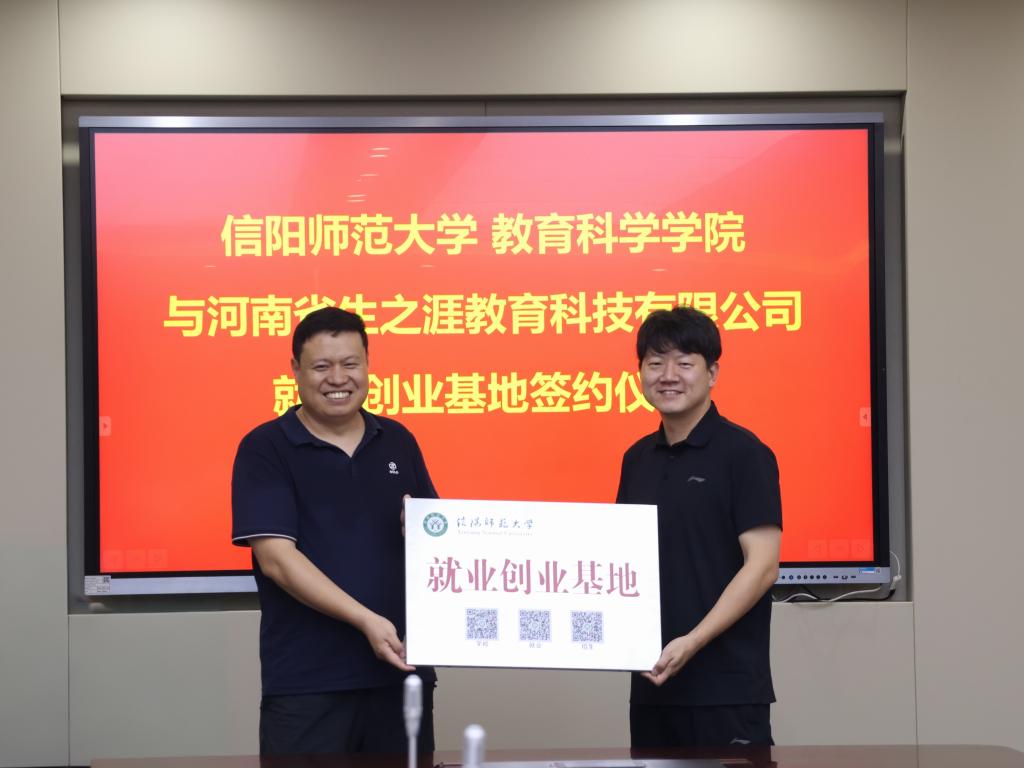 緱星代表學(xué)院分別與各用人單位簽署校企合作協(xié)議,并向鄭州市第十七高級(jí)中學(xué)、河南省生之涯教育科技有限公司、澳德菲爾工程科技(河南)有限公司授予“信陽師范大學(xué)就業(yè)創(chuàng)業(yè)基地”牌匾。