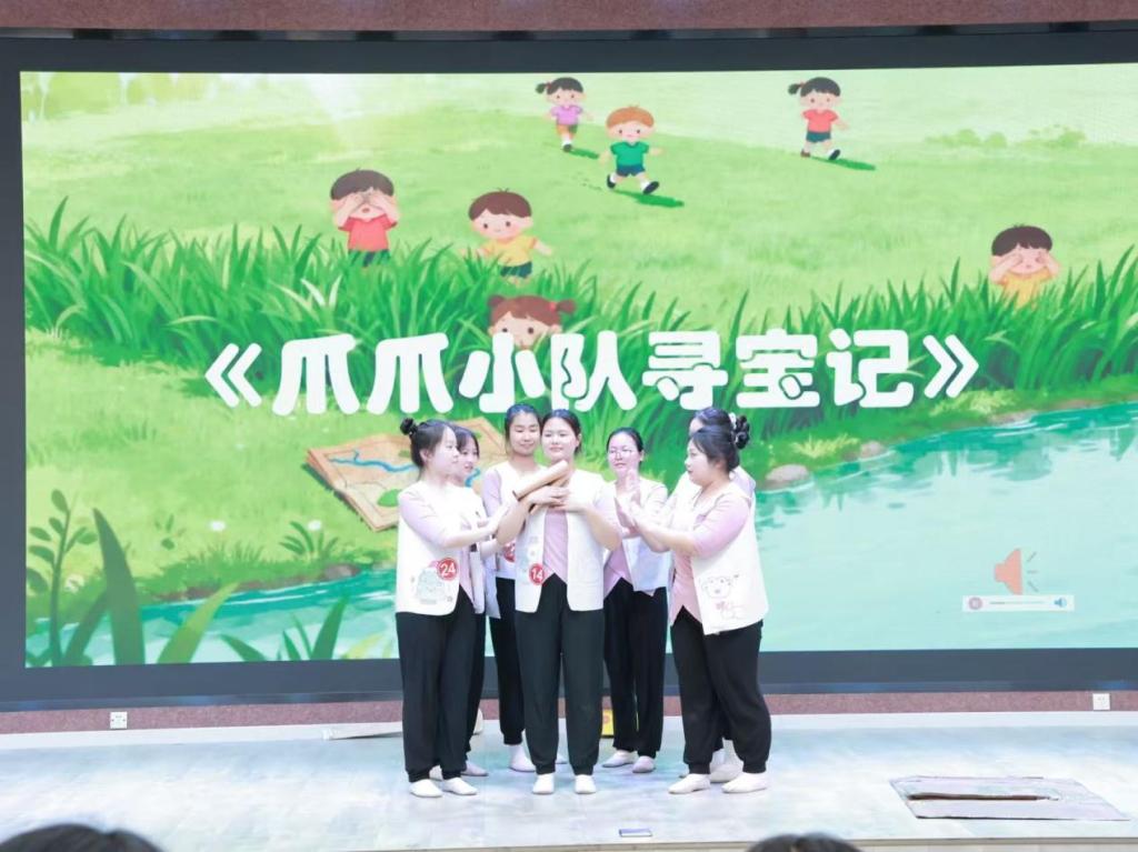 比賽中,同學(xué)們緊扣幼兒身心發(fā)展規(guī)律,以兒童視角為出發(fā)點(diǎn),將藝術(shù)創(chuàng)意與教育意義深度融合。其中,《牙牙樂成長記》通過擬人化編排展現(xiàn)牙齒生長過程,簡單易學(xué)的動(dòng)作、明快活潑的節(jié)奏完美適配幼兒肢體特點(diǎn),傳遞健康生活理念;而《保衛(wèi)小樹苗》以情景化敘事為核心,大學(xué)生編創(chuàng)者巧妙設(shè)計(jì)守護(hù)綠植的舞蹈情節(jié),讓孩子們在表演中理解環(huán)保意義;此外,《咩咩歷險(xiǎn)記》則憑借可愛的動(dòng)物角色扮演、趣味十足的冒險(xiǎn)劇情,搭配貼合幼兒認(rèn)知的動(dòng)作設(shè)計(jì),贏得現(xiàn)場陣陣掌聲。與此同時(shí),《不做低頭小寶貝》《不準(zhǔn)吃那個(gè)蘋果!》等作品,分別圍繞健康用機(jī)、安全常識等主題展開,既保留童真童趣,又暗藏教育巧思。